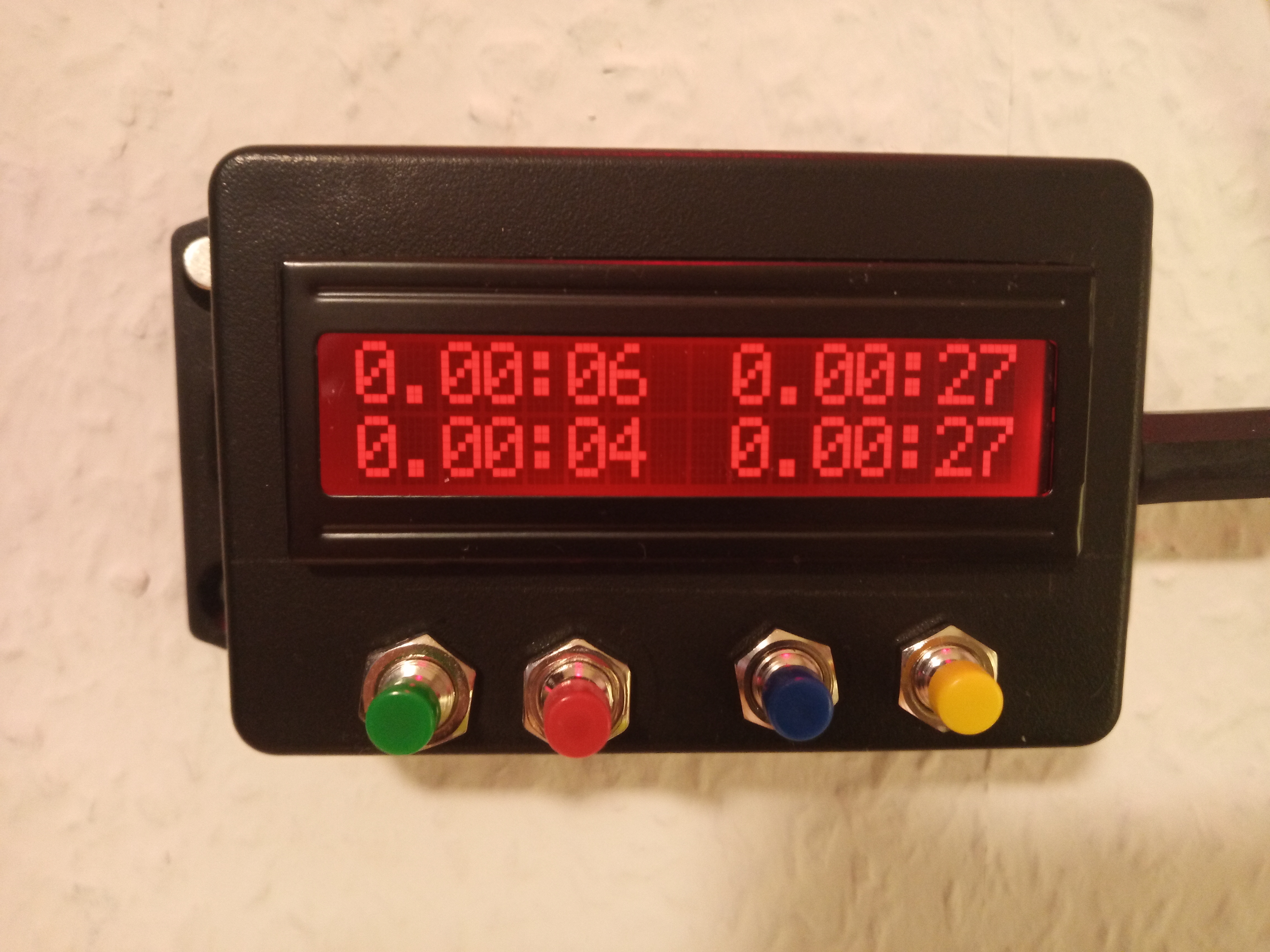 During the development of the prints, the paper has to stay in the various baths for some predetermined time. I usually use four baths. Namely, developer, stopper, fixation 1 and fixation 2. Based on the four baths I have implemented a small timer unit, that displays four "free" running timers. Each timer can be resetted by one of four push buttons. The LCD display uses a darkroom safe red backlight.