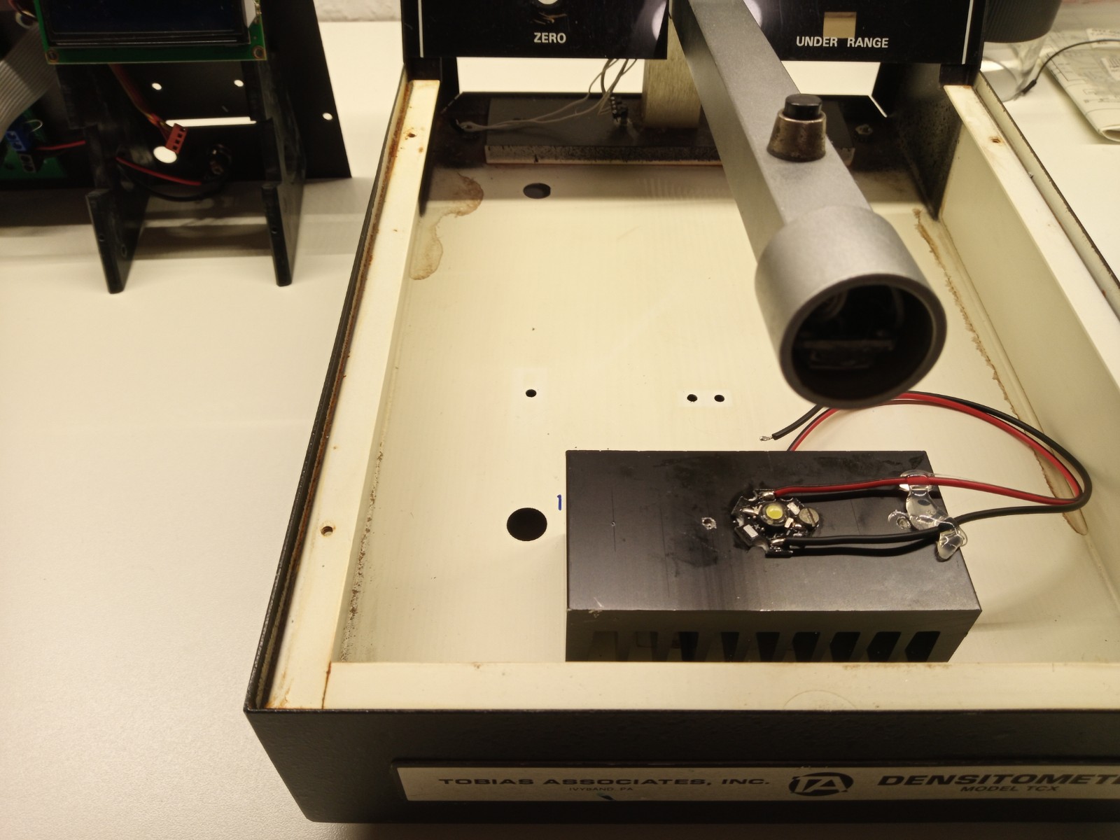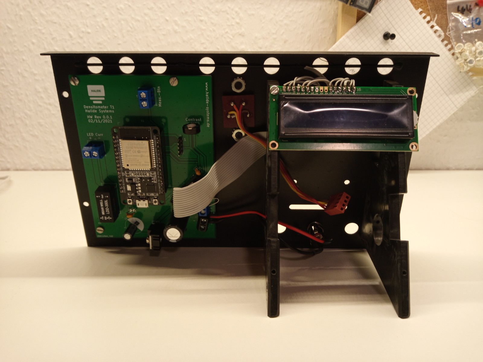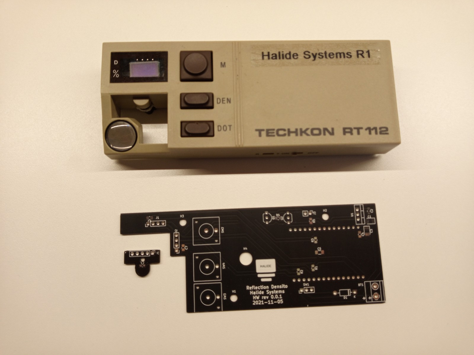 Update of an Techkon RT112. Basically only the enclosure was reused. Sensor element is a TSL2591, which is connected via I2C to an ESP32-based development board. An .49inch OLED display is used for reading out the measured density. Additionally the measurements are sent to the UART interface, so they can be transferred into a PC terminal directly. A white 3mm LED replaces the old bulb. The required constant current is stabilised using a simple two NPN-transistor circuit.