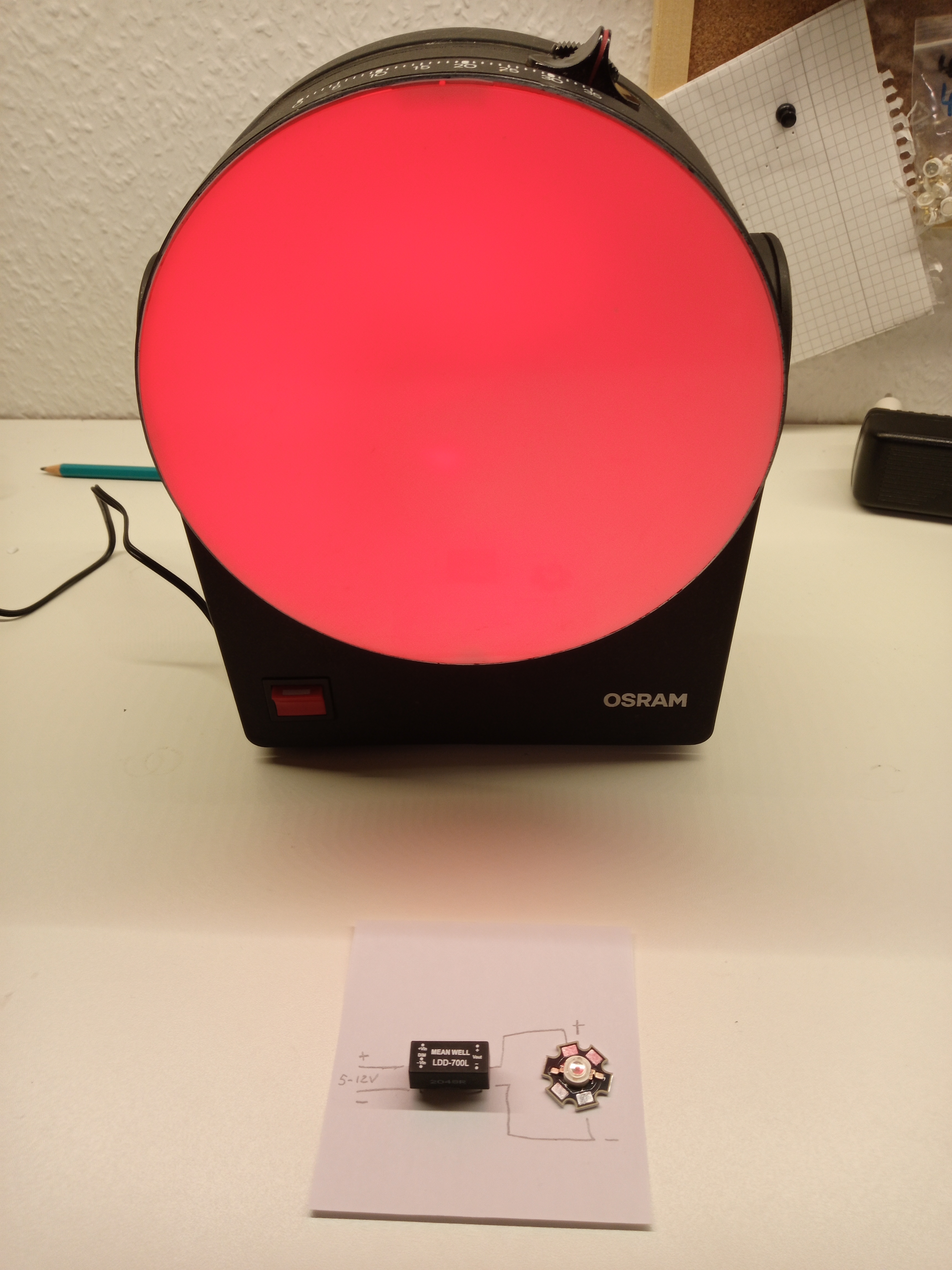 I recently got hold of a Osram Duka 10 darkroom safe light with a broken blub (I like its design). As the special sodium-vapor blub is not easy to replace (or rather expensive), I ended up installing a single high-power red LED together with a constant current source (MeanWell LDD). The whole setup costed around 6€ - and now it can be used again. BTW, many old darkroom lights use standard 15W tungsten bulbs and therefore require an appropriate filter. Accordingly, the remaining emitted light is rather weak. LEDs with a rather limited emitted wavelength band are far more suitable for the darkroom.