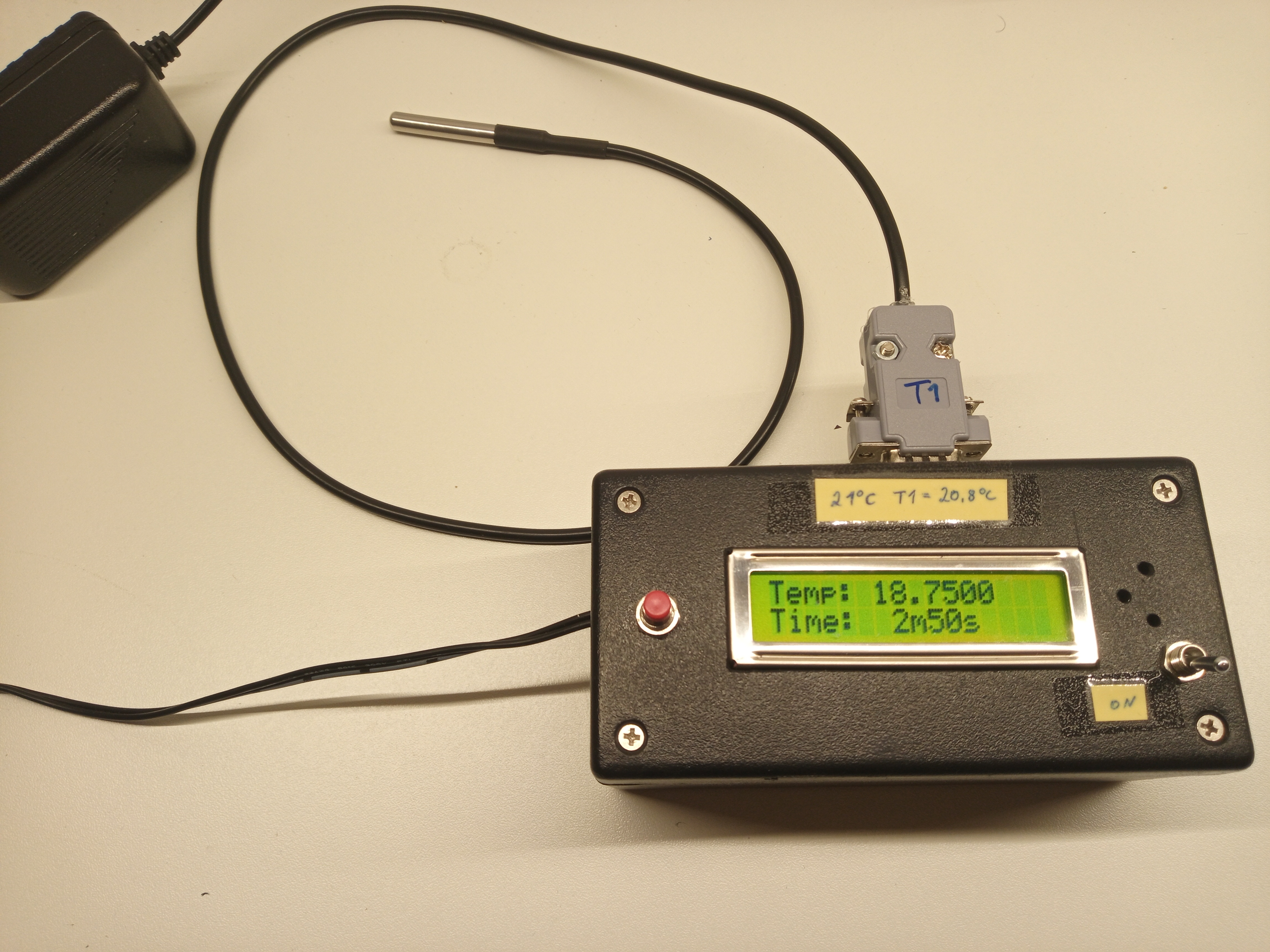 Before developing the film processor, I had already build a combined thermometer and timer unit. The thermometer is based on a DS18B20 1-wire thermometer with an accuracy of +-0.5°C (3-sigma value from the MAXIM datasheet). Although this accuracy is not really sufficient for the film development, it represents mainly a static offset (at a given temperature point) from the actual temperature. So once you have measured this offset (at close to 20°C), it can be used as a rather accurate instrument to determine the temperature of the developer. (More background info on the DS18B20 accuracy can be found here.) I use this device as my main lab thermometer. Additionally, I have three more DS18B20 sensors which can be attaced to the unit. Having documented the offsets of each device, I can easily replace the main sensor...and I would not need to re-calibrate my development times.