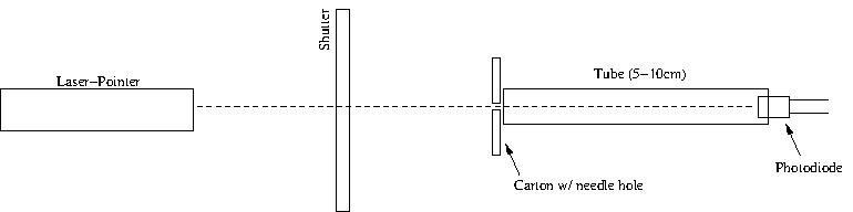 I own a couple of cameras without electronically controlled shutter timing - that is, these cameras are working purely mechanically. In order to check if camera shutter fulfills the correct timing, the Camera Shutter Checker has been developed. As shown in the measurement setup, the shutter checker uses a photo diode to detect when light is passing through the opened shutter. As the used photo diode exhibits a directional characteristic, it is important for an accurate measuement to restict the light to a "single" focused beam. This can be achieved, for example, by using the setup shown in Fig. 27. As light source a "standard" laser pointer can be used and the photodiode is placed within a tube. Additionally, a carton with a pin-hole is placed infront of the tube. Without such focused light beam, the measurement will become inaccurate at short shutter timings. Anyway, when interpreting the measurement results it is important to understand the limitations of the shutter time measurement using a photodiode. Due to the size of the active sensor element, their exists an error that is proportinal to the ratio of sensor width and shutter slit width. A way to get around this problem is to check the actual reverse current level of the photodiode to detect when the sensor area is completely exposed to light or partially covered. Mmmhhh...more work to do.